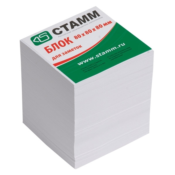 Блок для записей непроклеенный СТАММ имеет форму куба 8х8х8 см. Цвет листов белый. Листочки находятся в термоусадочной пленке с информационным вкладышем.