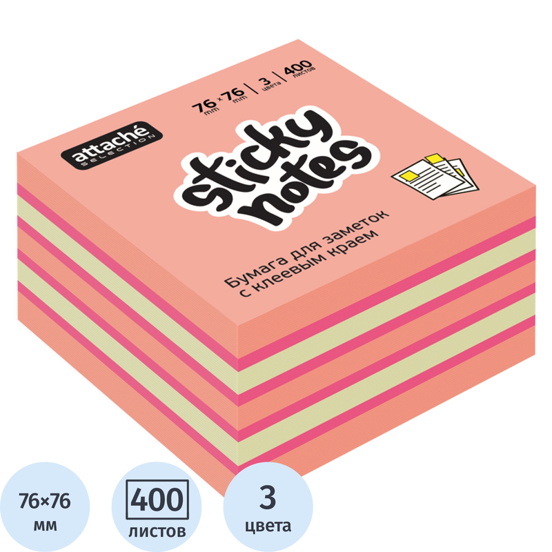 Стикеры Attache Selection 76х76 мм пастельные и неоновые 3 цвета (1 блок на 400 листов)