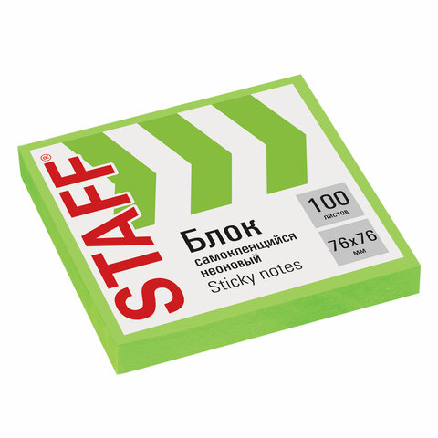Блок самоклеящийся (стикеры), STAFF НЕОНОВЫЙ, 76х76 мм, 100 листов, зеленый, 115585