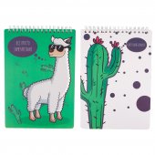 Бумажный блок изготовлен из офсетной бумаги, а переплет из картона. Разметка страниц - в клетку. Блокнот скреплен спиралью. Переплет украшен изображениями крутой ламы или цветущего кактуса.