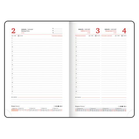 Внутренний блок включает 168 листов белой бумаги плотностью 70 г/м2. Каждая страничка имеет перфорированный угол. Благодаря стандартному формату А5 (138х213 мм) ежедневник удобно использовать как в офисе, так и на выездных деловых встречах.