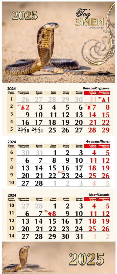 Красочный рисунок, двухцветная печать, выделены выходные и праздничные дни, присутствует понедельная нумерация. Блоки скреплены тремя пружинами, что дает возможность видеть одновременно три месяца. Есть прозрачная лента с окошком для выставления даты. Размер в развернутом виде (ширина × длина) 30×73 см.
