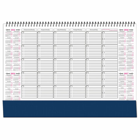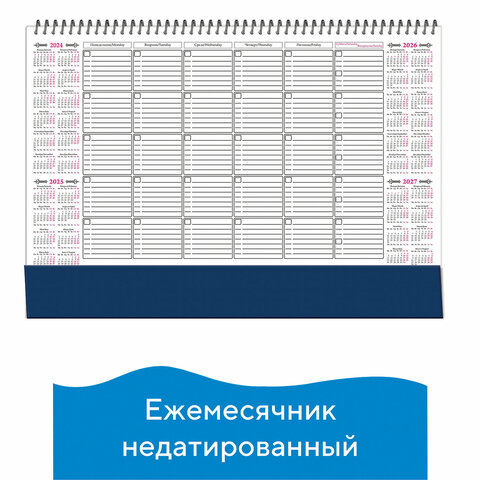 Планинг-ежемесячник настольный недатированный предназначен для ведения записей. На каждом листе — графы для всех дней текущего месяца, календарная сетка на четыре года и поле для заметок. Подложка выполнена из плотного картона.