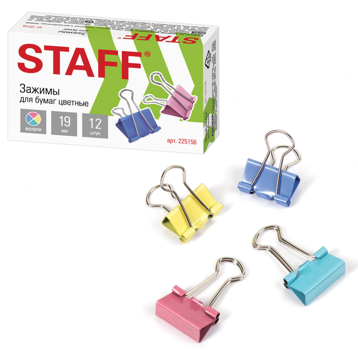 Зажимы для бумаг STAFF «Profit», КОМПЛЕКТ 12 шт., 19 мм, на 60 листов, цветные, картонная коробка, 225156