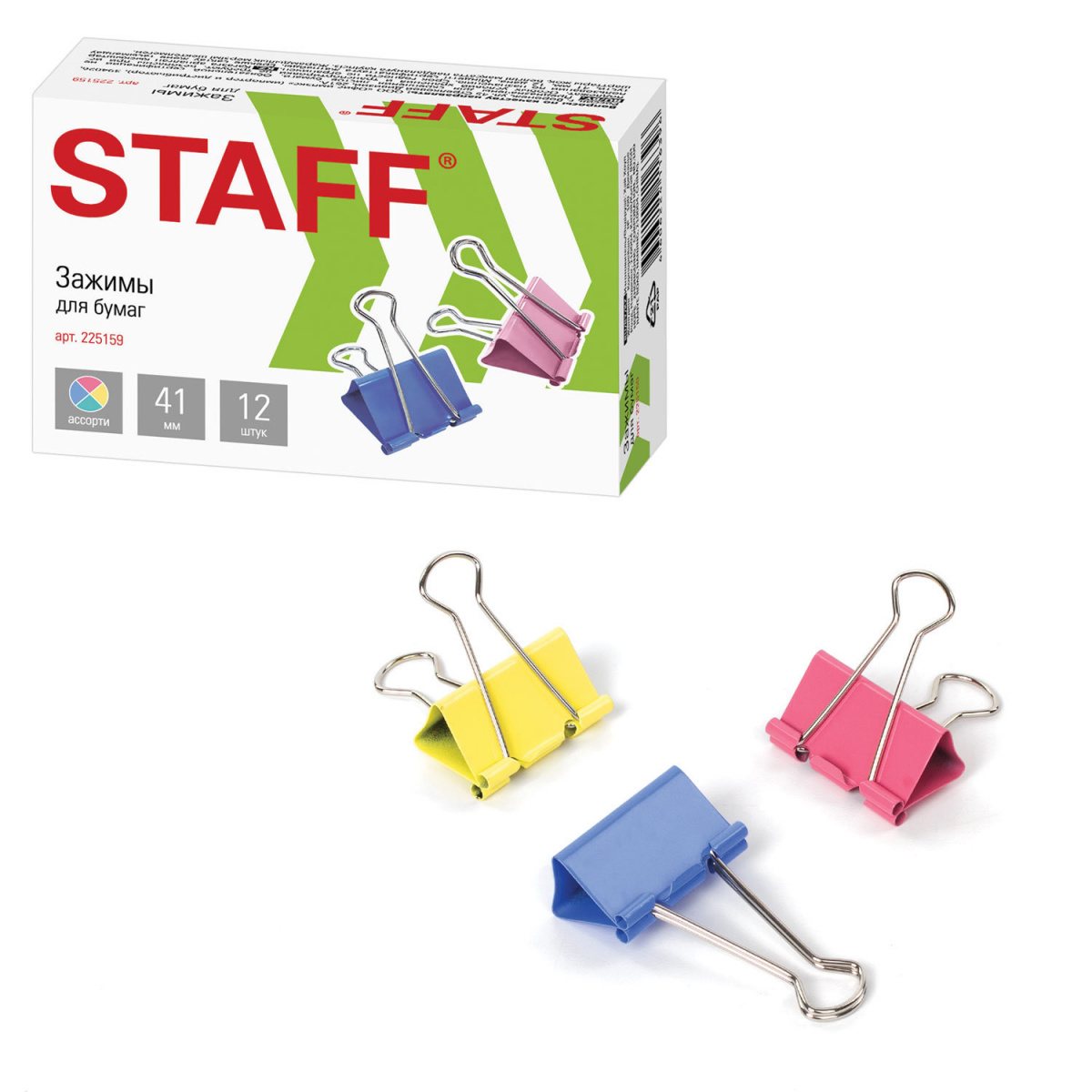 Зажимы для бумаг STAFF «Profit», КОМПЛЕКТ 12 шт., 41 мм, на 200 листов, цветные, картонная коробка, 225159