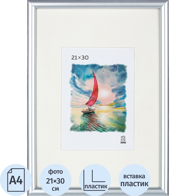 Рамка Зебра А4 21x30 см пластиковый багет 14 мм серебристая (PS 516)
