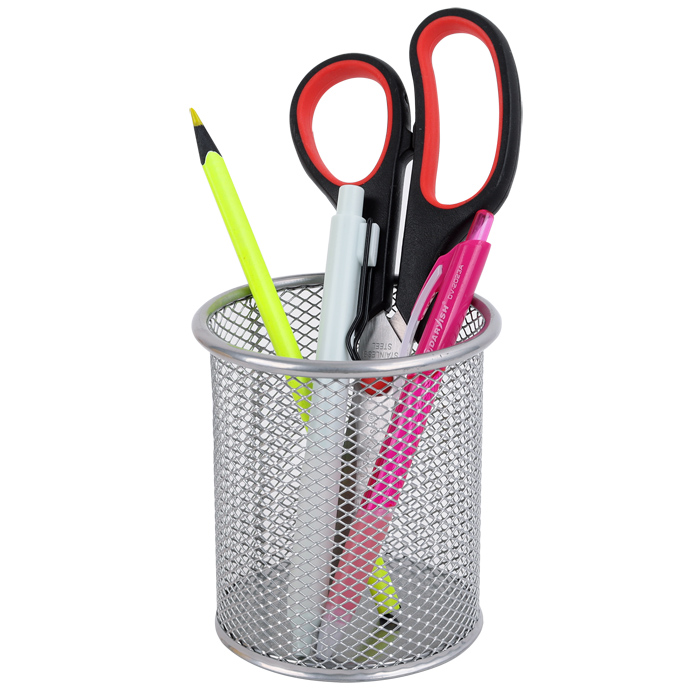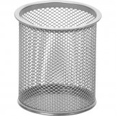 Стакан-подставка металлический для канцелярских принадлежностей круглый, цвет серый. Высота 10 см, диаметр 8 см.