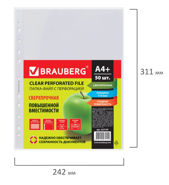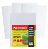 Файлы перфорированные BRAUBERG, А4+, комплект 50шт, глянцевые, 110 мкм используются для хранения документов формата А4, подходят для папок с кольцевым механизмом или любым скоросшивателем.