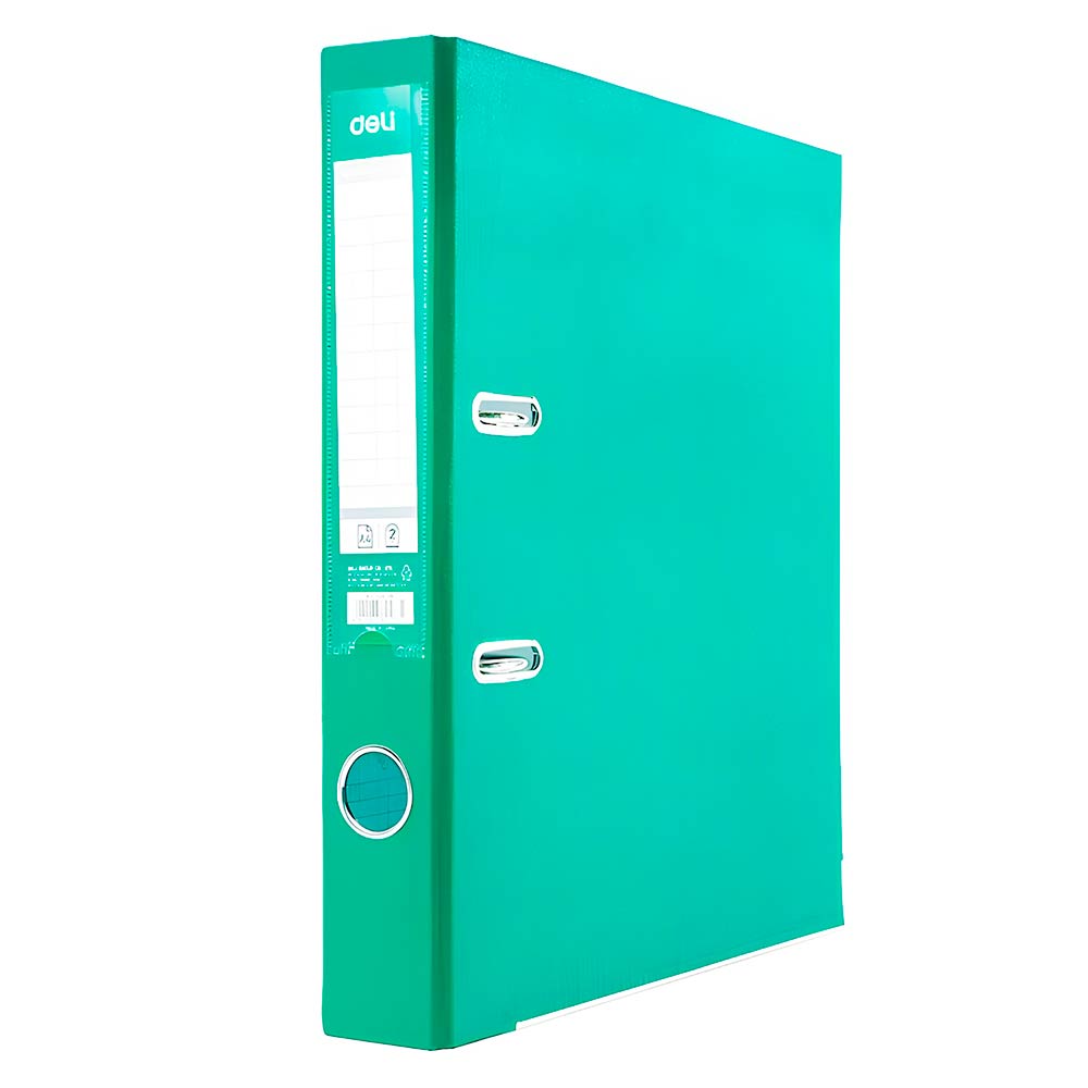 Папка-регистратор Deli из картона с ПВХ-покрытием и c металлическим уголком. Имеет на торце этикетку для подписи, круглое отверстие для захвата, на лицевой поверхности находятся прорези-замки для замыкания папки в закрытом состоянии.