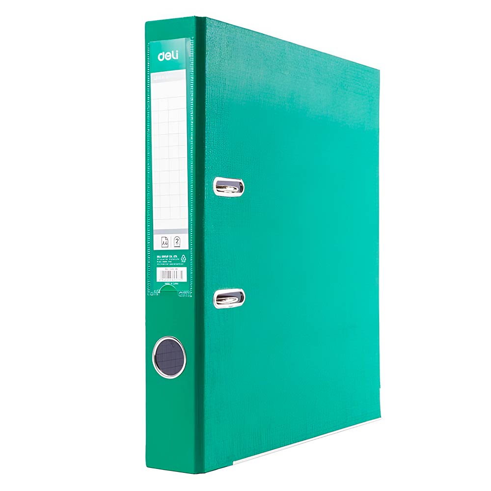 Папка-регистратор Deli из картона с ПВХ-покрытием и c металлическим уголком. Имеет на торце этикетку для подписи, круглое отверстие для захвата, на лицевой поверхности находятся прорези-замки для замыкания папки в закрытом состоянии. Цвет — тёмно-зелёный. Ширина корешка — 50 мм.