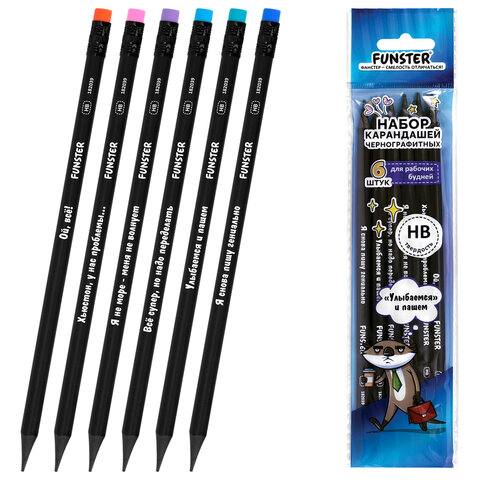 Набор карандашей чернографитных c забавной надписью FUNSTER (ФАНСТЕР) FUNNY NOTES BLK, 6 штук, HB, с ластиком, 182039