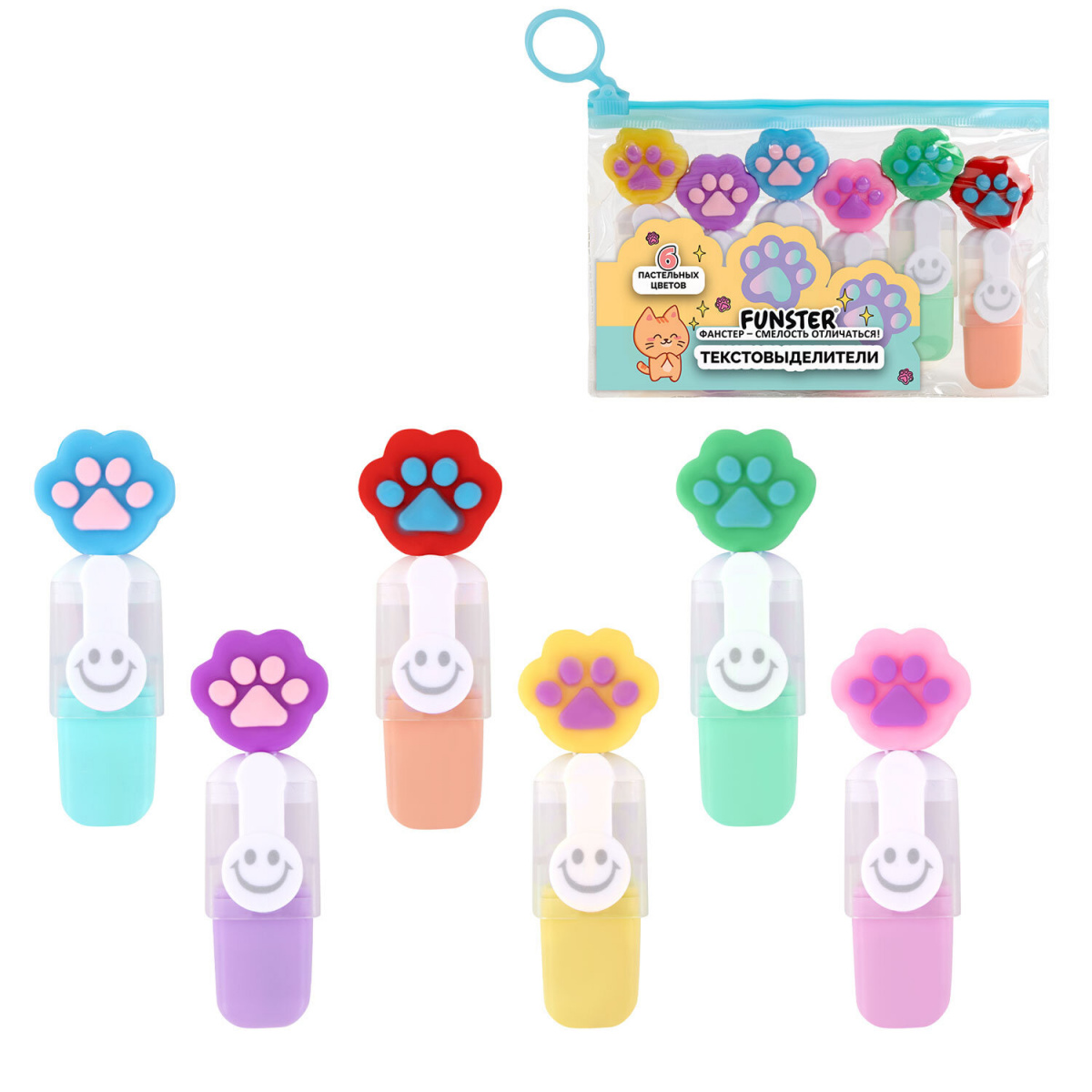 Набор текстовыделителей с топперами 6 ЦВЕТОВ ПАСТЕЛЬ, «ЛАПКИ», линия 1-4 мм, FUNSTER (ФАНСТЕР), 152650