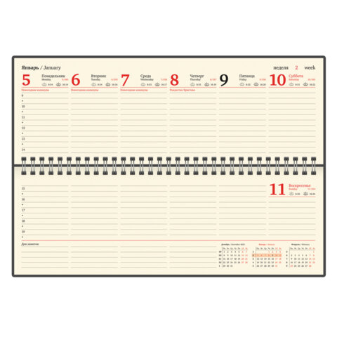 Внутренний блок содержит 60 листов офсетной бумаги кремового цвета плотностью 70 г/м2. Обложка из экокожи и твердый переплет обеспечивают долгий срок службы. Для заметок в планинге имеется 11 страниц в конце внутреннего блока. Подходит для горячего тиснения. Скрепление осуществляется с помощью евроспирали. Размер изделия – 305х140 мм.Характеристики